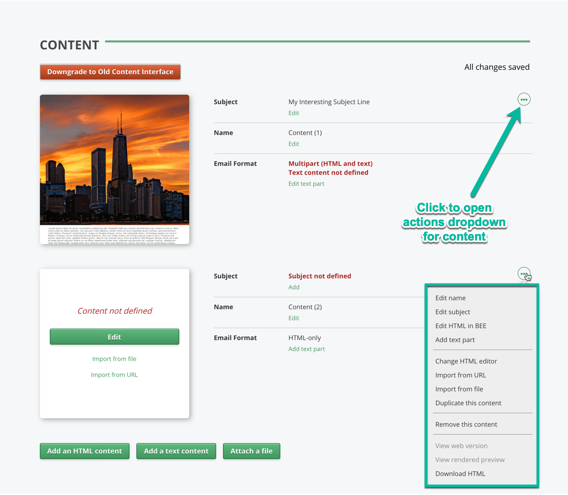 Add text partorEdit text partlinks. If you add a text part to the content, you cannot send the campaign until it is defined. Note theText content not definedwarning next to theEdit text partlink.