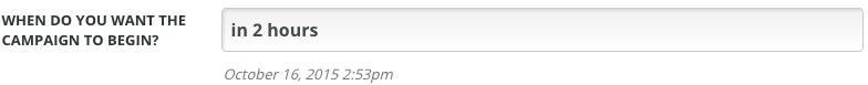 If you're scheduling the send for later, you can enter a specific date and time or just type in a time relative to now. For example, you can enter `in 2 hours`, and EmailIQ will understand what you mean, as shown by the text that was generated underneath the text field in the screenshot below: