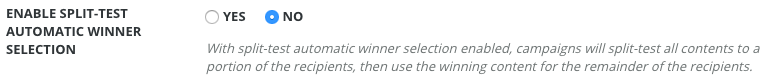 Split-Test Automatic Winner Selection Featureif you’d like. This feature, which is off by default causes Studio to perform a split test of all versions of a campaign, pick a winner based on a metric, such as click rate, and send the winner to the remaining subscribers who were not a part of the split test: