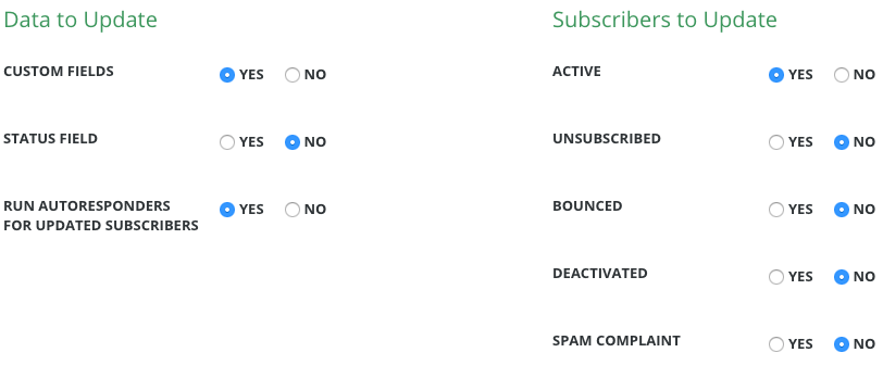 Update SubscriberstoYesif you’d like this import to be able to update existing subscribers. SelectNoif you’d like existing subscribers to be left unmodified: